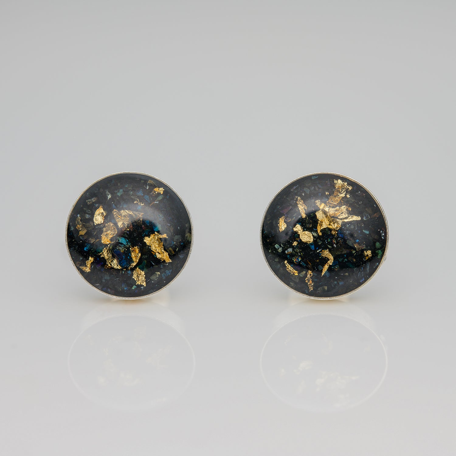Diese stilvollen Ohrstecker sind aus 925 Sterlingsilber gefertigt. Als besonderes Highlight verleihen die schimmernden Siliziumcarbid Splitter mit 24K Blattgold hinter der schützenden Epoxidharzschicht einen Hauch von Eleganz, während die hochglanzpolierte Oberfläche zugleich für ein edles Finish sorgt. Ohrstecker / Ohrringe werden immer paarweise geliefert.