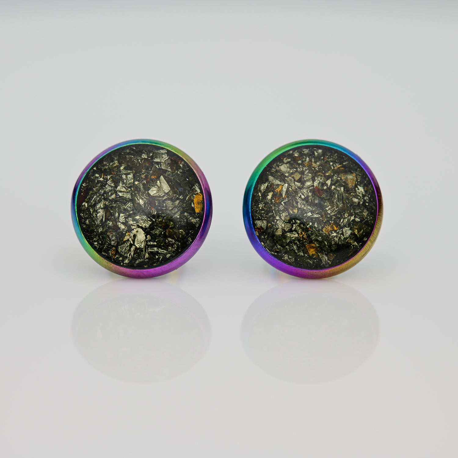 Diese stilvollen Ohrstecker sind aus Edelstahl 316L (mit Anlauffarben, erzeugt durch erhitzen) gefertigt, der neben seiner hohen Qualität auch für Materialeigenschaften wie hohe Beständigkeit bekannt ist. Als besonderes Highlight verleihen die schimmernden Chalkopyrit Splitter hinter der schützenden Epoxidharzschicht einen Hauch von Eleganz, während die hochglanzpolierte Oberfläche zugleich für ein edles Finish sorgt. Ohrstecker / Ohrringe werden immer paarweise geliefert.