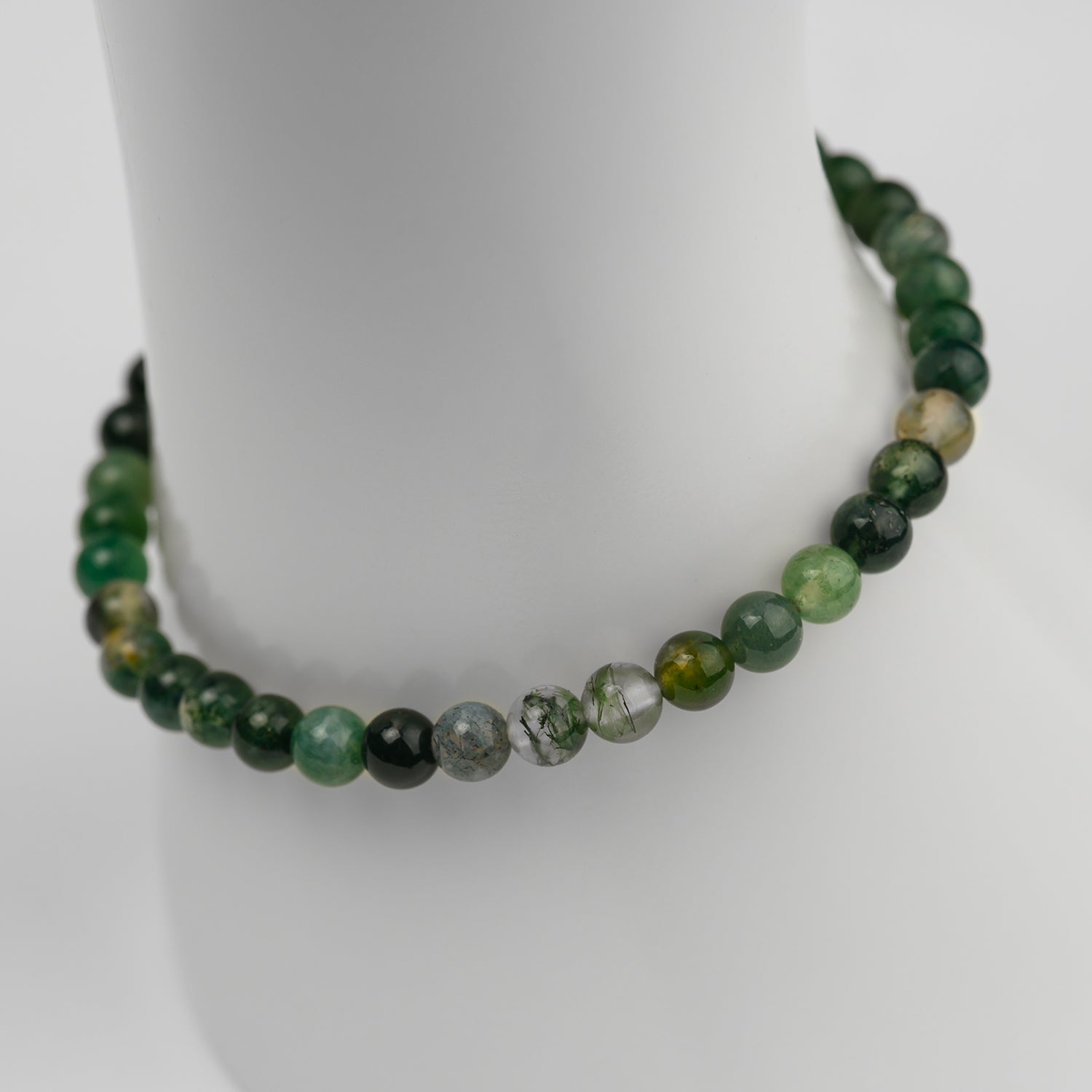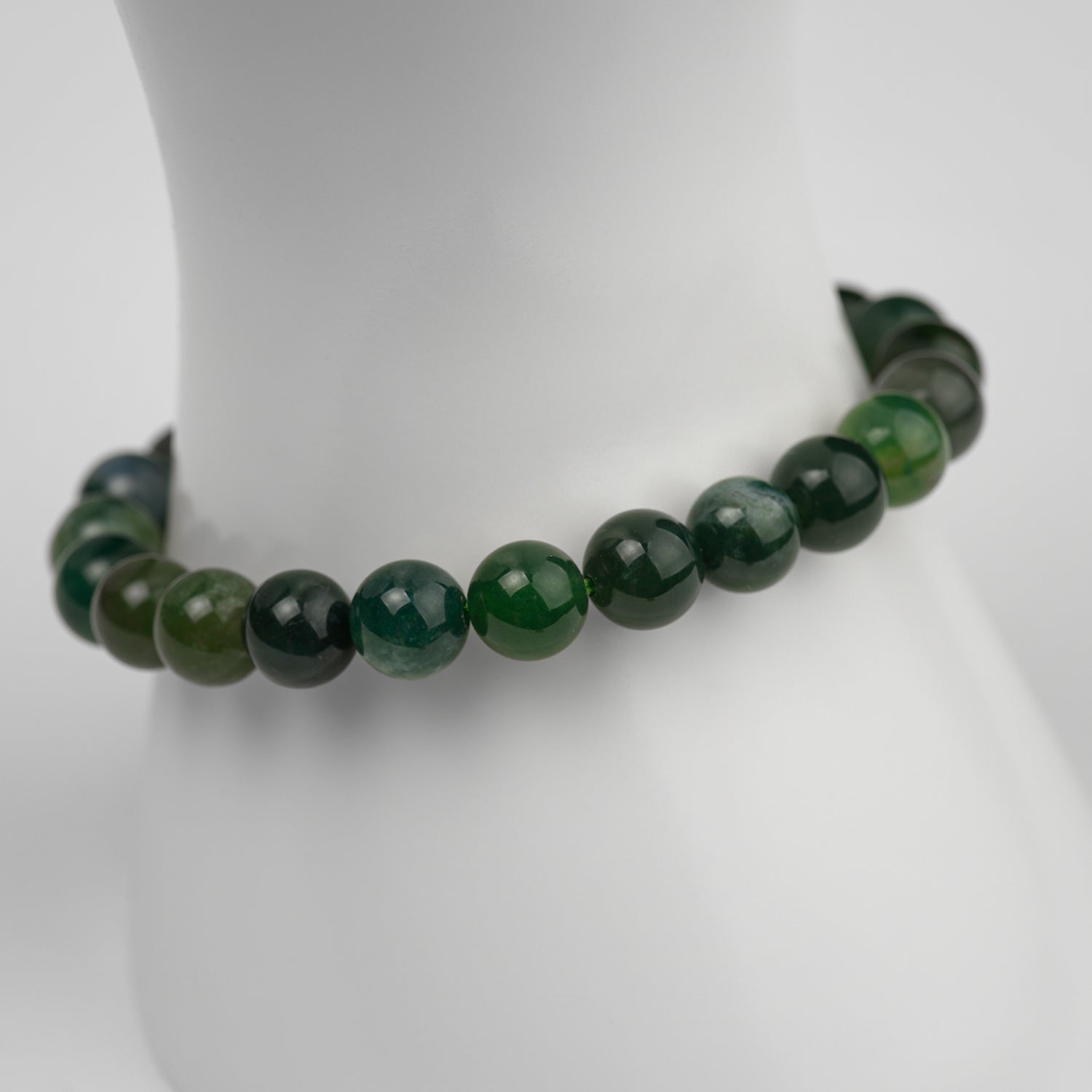 - Edelstein Armband mit runden Perlen aus Moos Achat, aufgezogen auf einen elastischen Nylonfaden, daher flexibel und bequem anzulegen. Das Armband hat eine Tragelänge von max. 18 - 20 cm